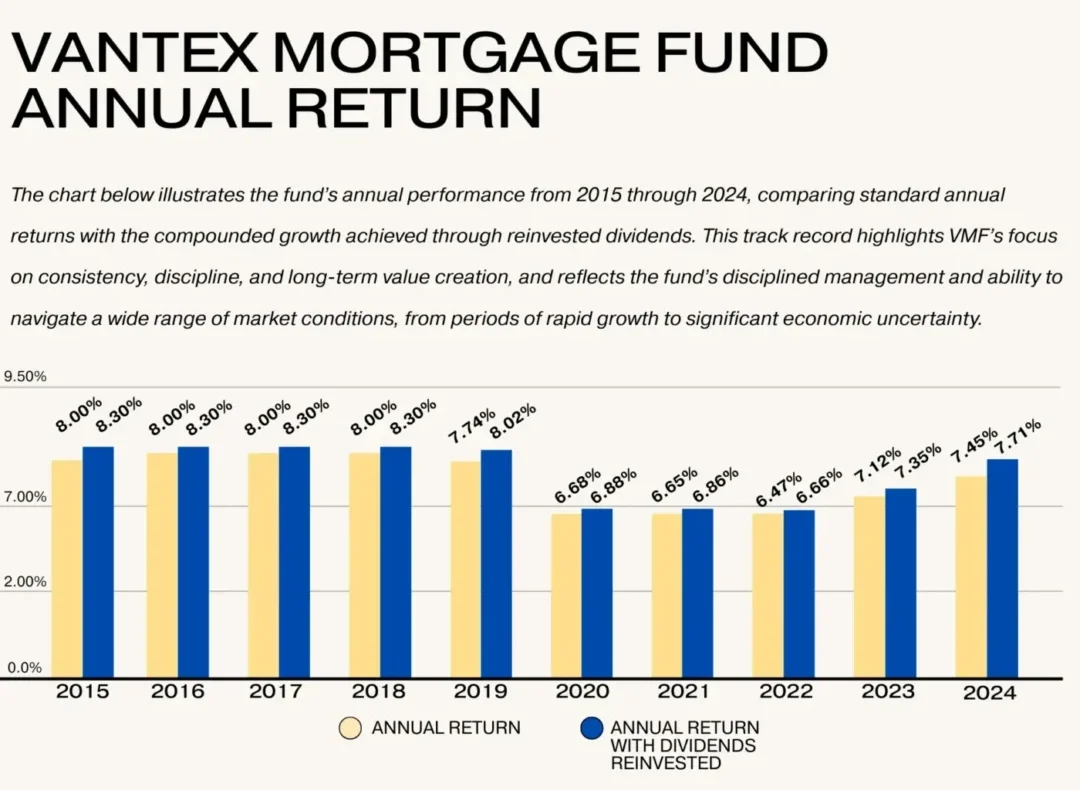 The Vantex Mortgage Fund is designed for accredited investors seeking stable, real estate–backed income with the option to take monthly dividends or reinvest for long-term growth. If you would like to learn more, we invite you to connect with our team directly.